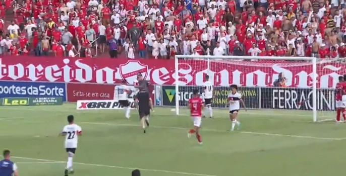 Torcedor do Vila Nova invade o campo e chuta o atacante Neto Pessoa após pênalti perdido.