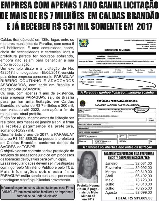 O Jornal dos Municípios, que circula na Grande JP em versão impressa e tem sua página na internet, denunciou nessa semana um contrato milionário entre a Prefeitura de Caldas Brandão e o Escritório de Advocacia Paraguay Ribeiro Coutinho e Advogados Associados, no valor de R$ 7 milhões e 200 mil, com validade até 2022. Segundo a matéria […]