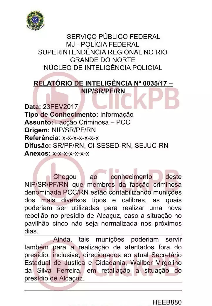 A Polícia Federal alertou o deputado estadual Walber Virgulino (Patriota) através de um documento, sobre o possível esquema para matá-lo. Segundo o documento, o alerta foi emitido através de relatório nº 0035/17 em 23 de fevereiro de 2017, época em que Virgulino ocupava a Secretaria de Justiça de Cidadania do Rio Grande do Norte.