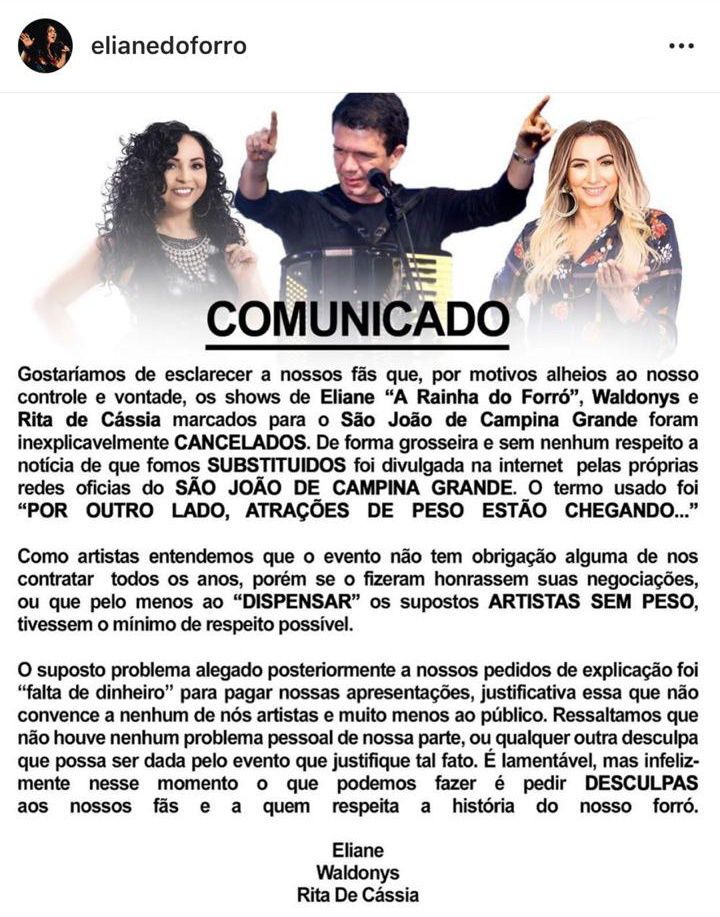 “Os shows de Eliane, Waldonys e Rita de Cássia marcados para o São João de Campina Grande foram inexplicavelmente cancelados. De forma grosseira e sem nenhum respeito a notícia de que fomos substituídos foi divulgada na internet pelas próprias redes sociais do São João de Campina Grande. O termo usado foi “por outro lado atrações de peso estão chegando”. Como artistas entendemos que o evento não tem obrigação alguma de nos contratar todos os anos, porém se o fizeram honrassem suas negociações ou que pelo menos ao dispensar os supostos artistas sem peso tivessem o mínimo respeito possível.