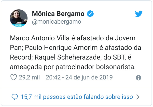 De maneira sucinta, sem tecer uma opinião propriamente dita, a colunista da Folha, Mônica Bergamo resumiu o quadro da censura. Marco Antonio Villa é afastado da Jovem Pan; Paulo Henrique Amorim é afastado da Record; Raquel Scheherazade, do SBT, é ameaçada por patrocinador bolsonarista.