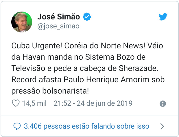 “Cuba Urgente! Coréia do Norte News! Véio da Havan manda no Sistema Bozo de Televisão e pede a cabeça de Sherazade. Record afasta Paulo Henrique Amorim sob pressão bolsonarista”, tuitou.