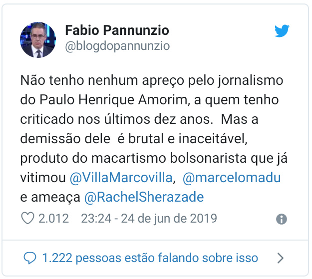 Através do Twitter, o jornalista Fabio Pannunzio demonstrou solidariedade aos seus colegas de profissão. “Não tenho nenhum apreço pelo jornalismo do Paulo Henrique Amorim, a quem tenho criticado nos últimos dez anos. Mas a demissão dele é brutal e brutal e inaceitável, produto do marcartismo bolsonarista que já vitimou Marco Antonio Villa, Marcelo Madureira e ameaça a Rachel Sheherazade”, escreveu.