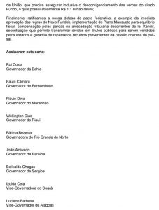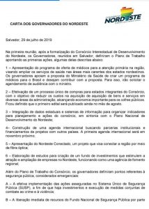 Confira abaixo a íntegra da Carta dos Governadores do Nordeste: