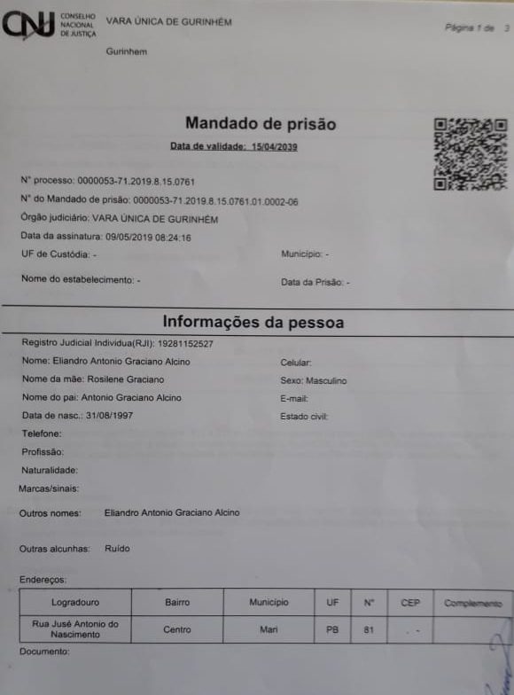 Segundo informações da polícia, Eliandro Antonio Graciano Alcino se apresentou para a audiência quando foi constado que constava contra o mesmo um mandando de prisão da Comarca de Gurinhém.
