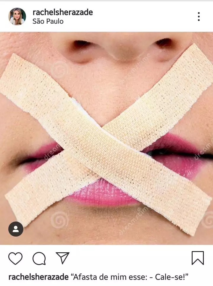Após ser afastada do SBT Brasil, Rachel Sheherazade fez uma publicação em sua página no Facebook. A jornalista comanda o principal telejornal do SBT há oito anos. Na seguinte postagem, ela colocou a foto de uma boca tampada com duas fitas, dando a entender que está impedida de opinar.