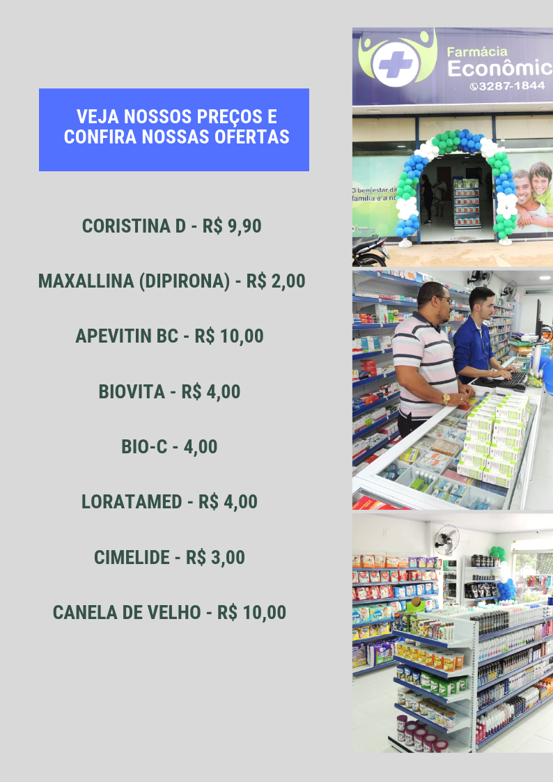 Para maiores informações e serviços da Farmácia Econômica, basta entrar em pelo (083) 99344-7786 e fale com o gerente Bruno.