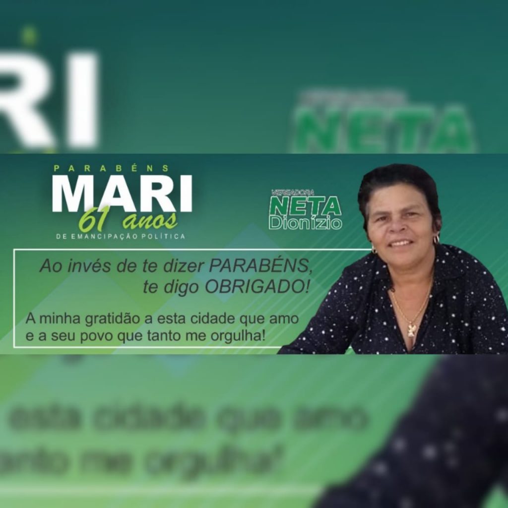 A vereadora Neta Dionízio, a popular Neta do Sindicato, aproveita a passagem dos 61 anos da cidade de Mari para se congratular com o povo mariense: Da Redação Do ExpressoPB