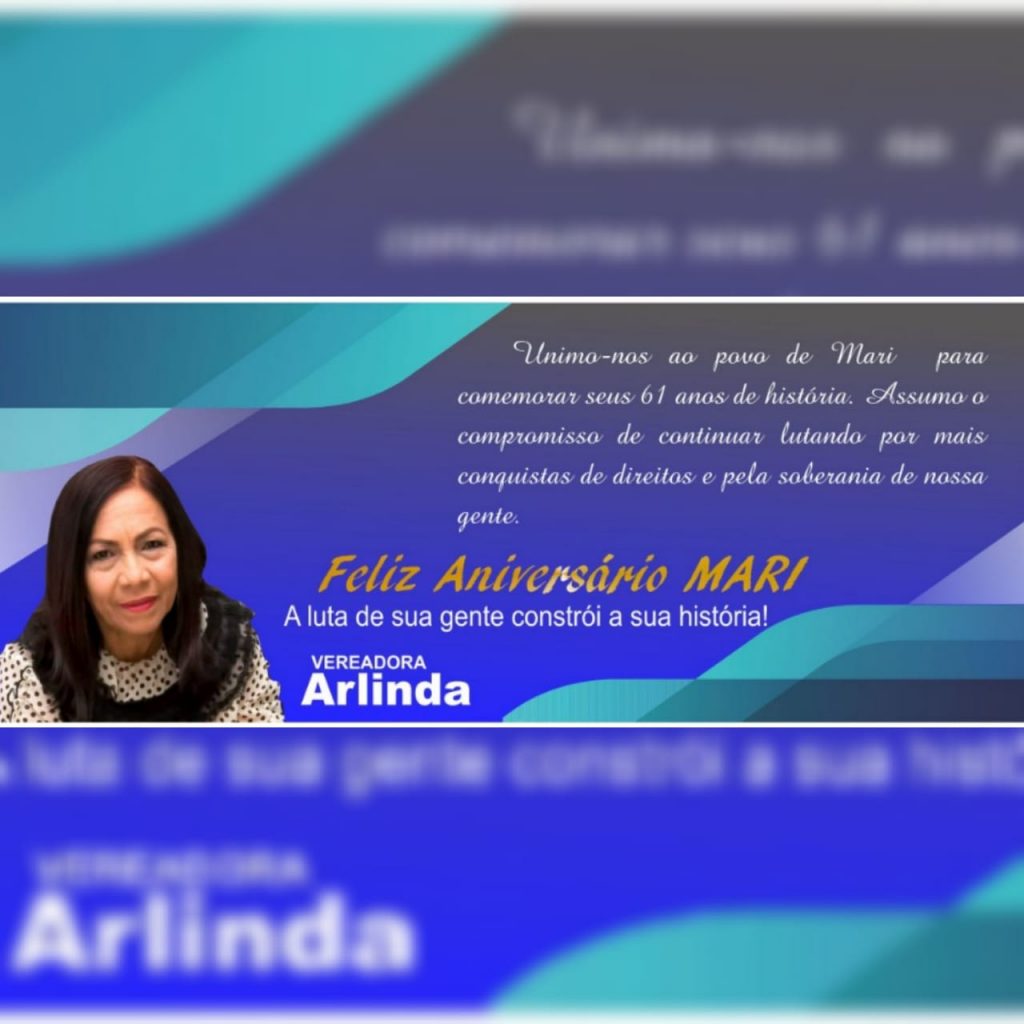 Em mensagem publicada na revista EXPRESSO, a vereadora Arlinda Meireles se congratula com toda a população mariense pela passagem dos 61 anos da emancipação política do município. Veja: Leia também: Mari, 61 anos: Prefeito de Mari parabeniza a cidade por sua emancipação política neste dia 19 Da Redação Do ExpressoPB