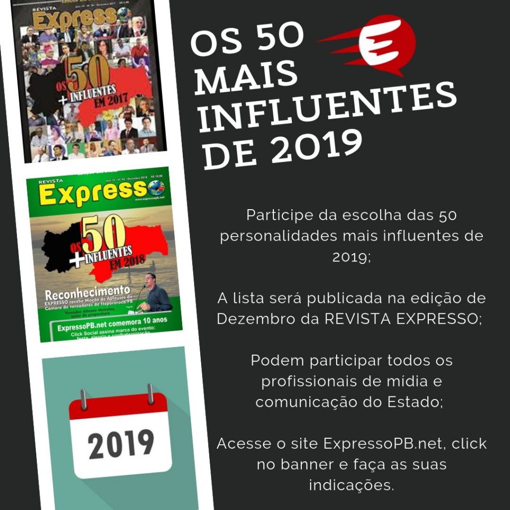 A Revista EXPRESSO , edição de nº 57 , deve entrar em circulação no próximo final de semana com a lista das 50 Personalidades mais influentes de 2019 na PB, repetindo a publicação dos anos anteriores. A escolha foi feita através de sondagem com profissionais de imprensa de todo o estado desde setembro. Participaram da escolha da […]