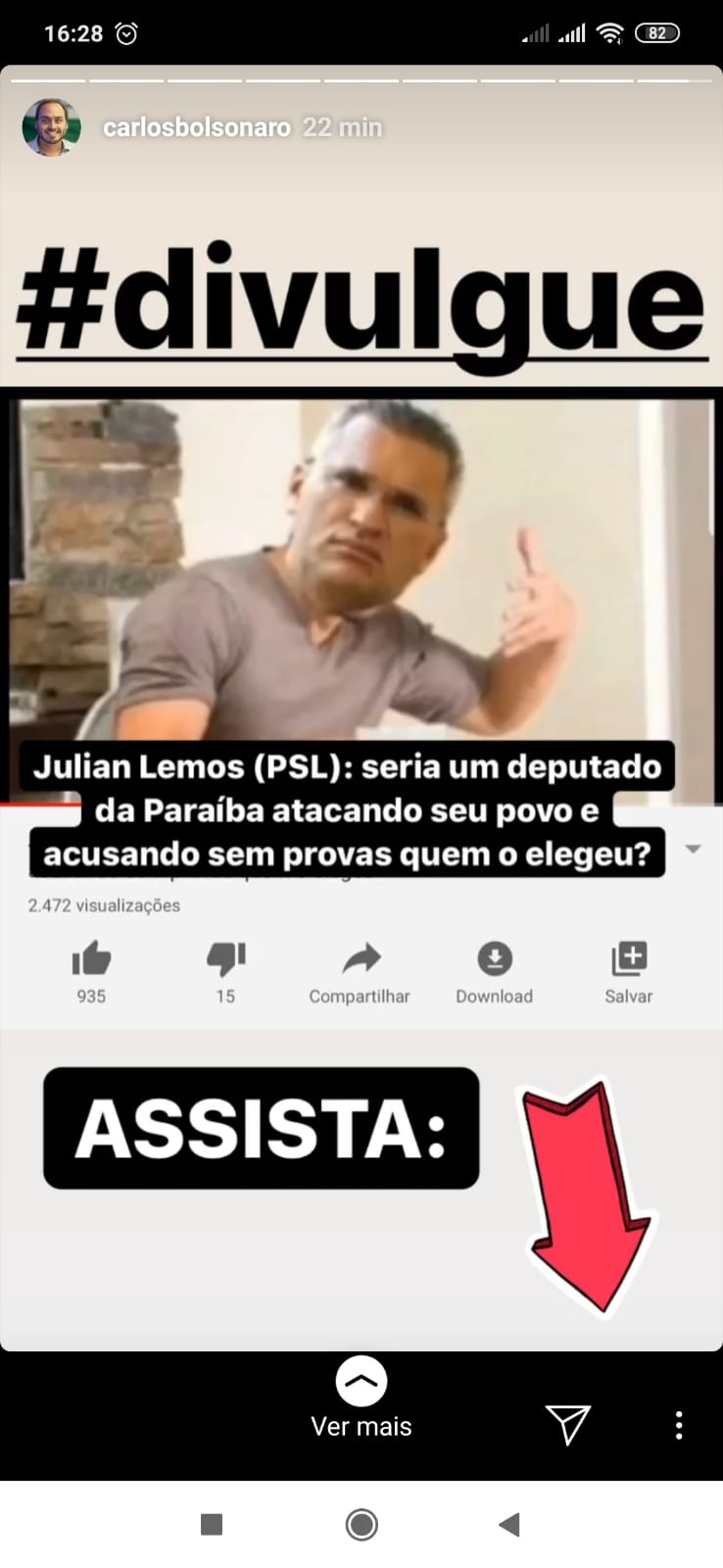 O vereador Carlos Bolsonaro, filho do presidente Jair Bolsonaro, voltou às redes sociais neste domingo (29), mirando artilharia pesada contra o deputado federal paraibano Julian Lemos (PSL). Em publicação nos stories, o parlamentar posta o link de um vídeo em que Julian estaria sendo contra os paraibanos que o elegeram.