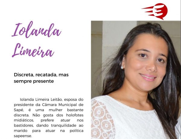 Iolanda Limeira Leitão, esposa do presidente da Câmara Municipal de Sapé, é uma mulher bastante discreta. Não gosta dos holofotes midiáticos, prefere atuar nos bastidores, dando tranquilidade ao marido para atuar na política sapeense.
