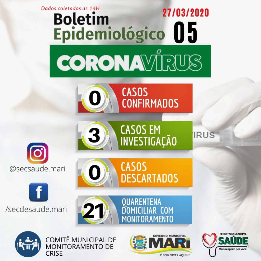 A Secretaria Municipal de Saúde e o Comitê de Monitoramento de Crise do Município de Mari-PB divulgaram na tarde desta sexta-feira (27) o 5º Boletim Epidemiológico sobre o Coronavírus (COVID 19). Segundo o boletim, os dados foram reunidos às 14 horas e apresenta o surgimento do 3º caso de investigação por possível infecção pelo COVID […]
