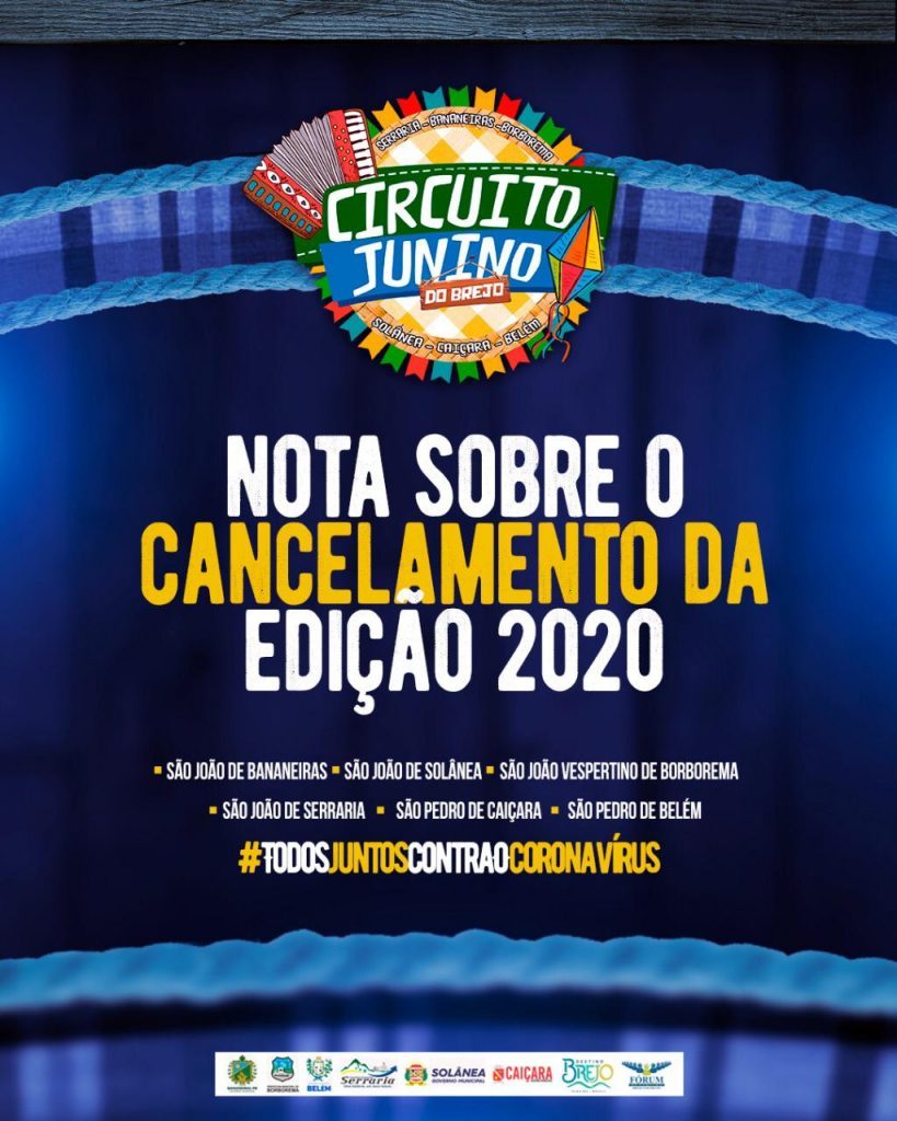 Os Prefeitos das cidades de Bananeiras, Solânea, Belém, Borborema, Serraria e Caiçara decidiram em conjunto na manhã desta segunda (06) pelo cancelamento do Circuito Junino do Brejo 2020, em decorrência da pandemia causada pela Covid 19. O aumento gradativo de casos em proporção mundial e seguindo o protocolo da Organização Mundial de Saúde (OMS), para […]
