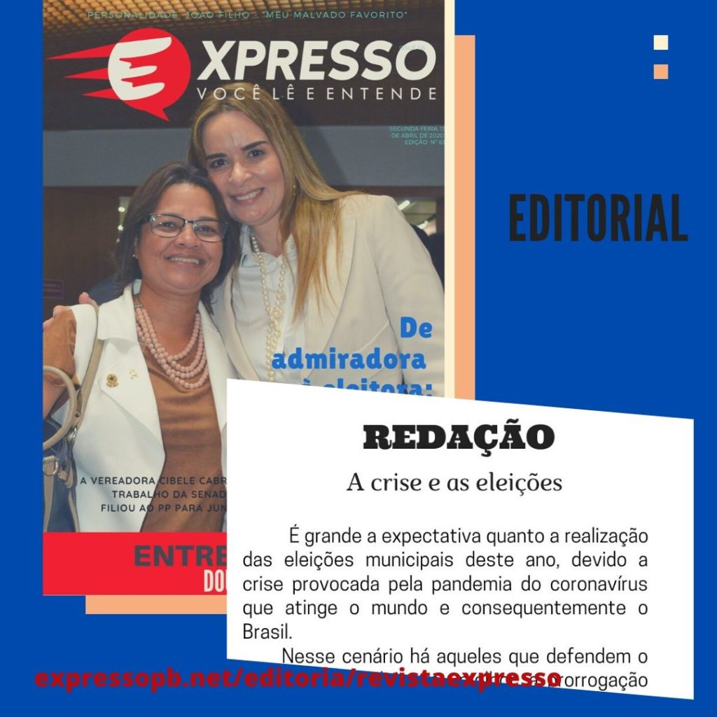 O Editorial da edição de nº 62 da Revista EXPRESSO desta semana destaca os efeitos da crise provocada pelo coronavírus e a possibilidade de adiamento das eleições municipais deste ano. A edição da semana da Revista EXPRESSO está disponível nas nossas plataformas digitais e na plataforma do ExpressoPB.net e o internauta pode conferir AQUI. Da Redação Do ExpressoPB/Editoria Revista EXPRESSO