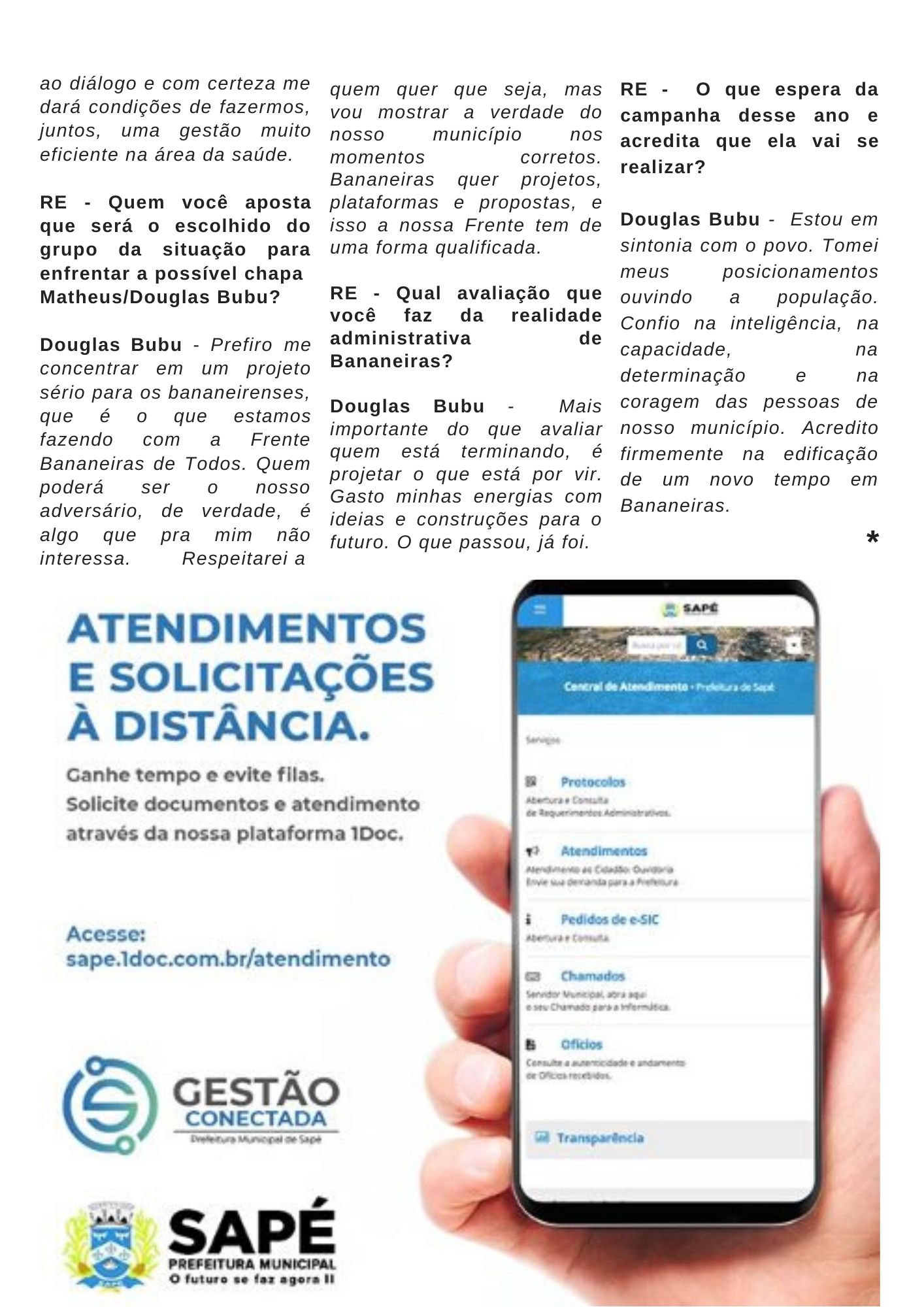 A ENTREVISTA da edição de nº 62 da Revista EXPRESSO é com jovem Douglas Andrade da Costa, vereador da cidade de Bananeiras. no brejo paraibano. Ele é pré-candidato a vice-prefeito pela oposição. A versão da EXPRESSO é totalmente digital, está disponível em nossa plataforma no ISSU e na flipsnack e em nossa plataforma aqui no site.