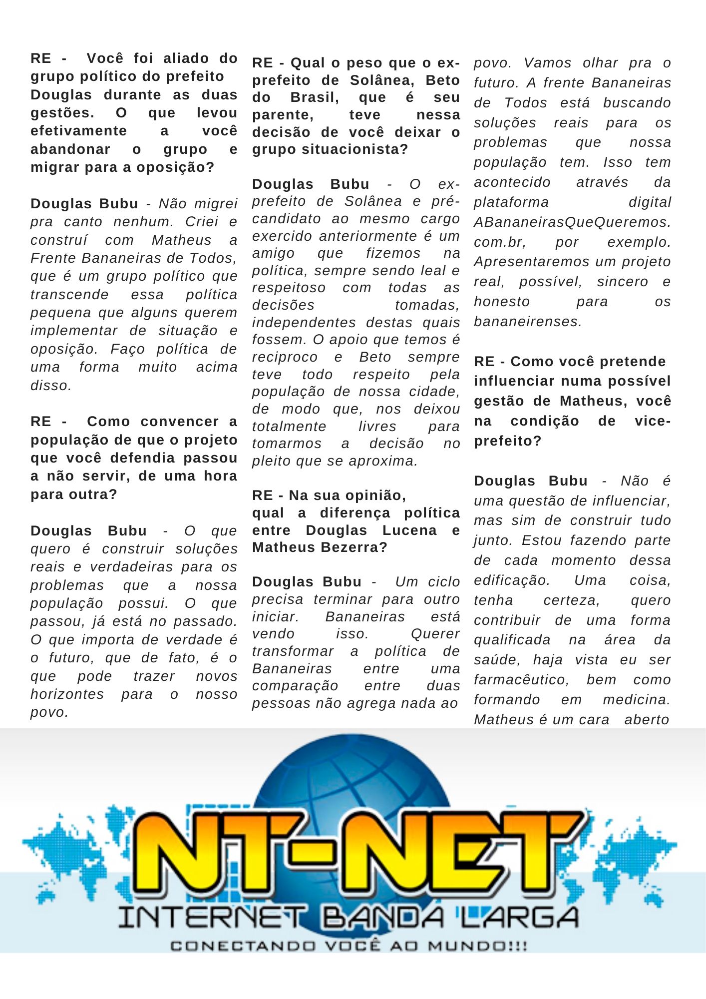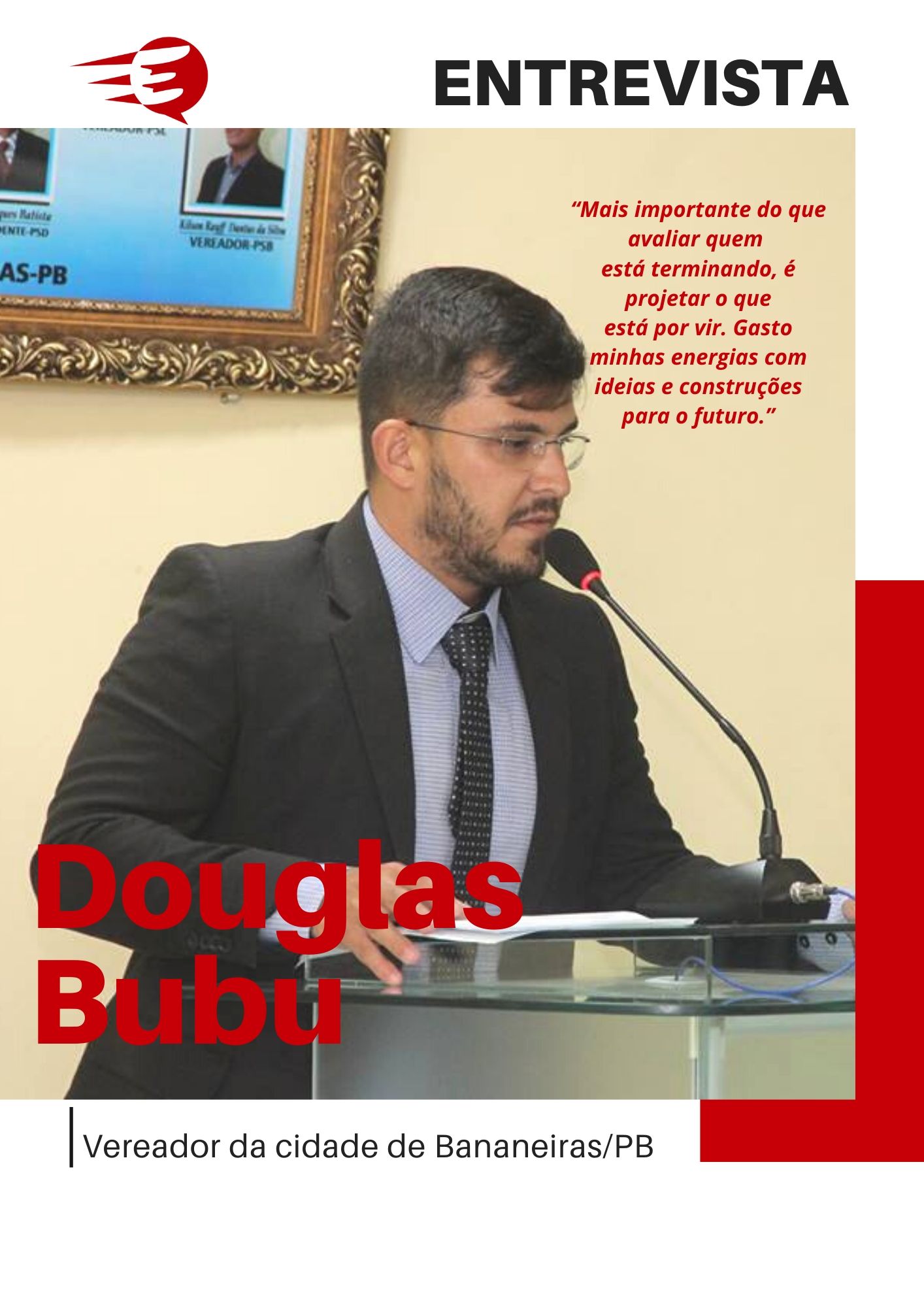 A ENTREVISTA da edição de nº 62 da Revista EXPRESSO é com jovem Douglas Andrade da Costa, vereador da cidade de Bananeiras. no brejo paraibano. Ele é pré-candidato a vice-prefeito pela oposição. A versão da EXPRESSO é totalmente digital, está disponível em nossa plataforma no ISSU e na flipsnack e em nossa plataforma aqui no site.