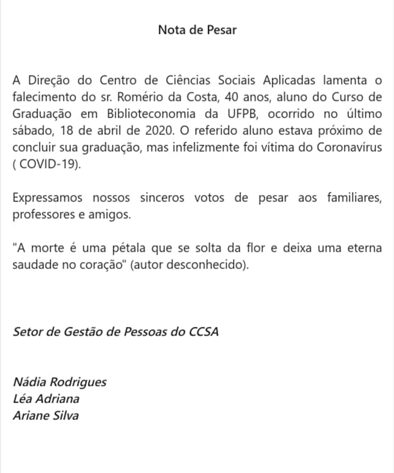 A Universidade Federal da Paraíba, por meio da Direção do Centro de Ciências Sociais Aplicadas (CCSA) emitiu nota de pesar, nesta segunda-feira (20), pelo falecimento do estudante Romério da Costa, vítima de covid-19, que faleceu no último sábado (18).