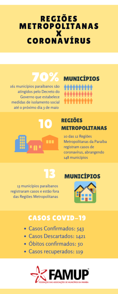 Dez das 12 Regiões Metropolitanas da Paraíba já registram casos de coronavírus. Ao todo, são 161 municípios (148 em Regiões Metropolitanas e 13 fora delas) que são atingidos pelo Decreto Nº 40188 DE 17/04/2020 do Governo do Estado, que estende as medidas de isolamento social até o próximo dia 3 de maio, em decorrência da […]