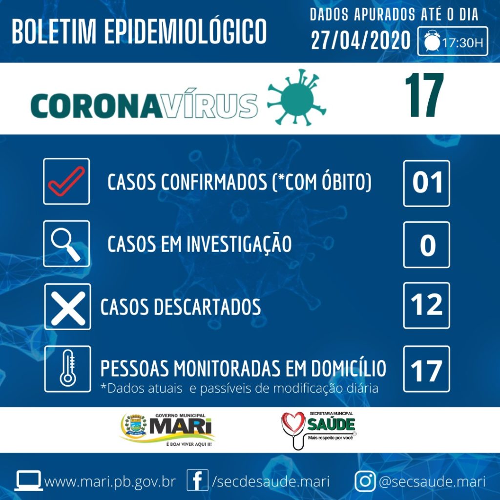 (Última atualização: 18h44) A Secretaria de Saúde do município de Mari, Zona da Mata da PB, acaba de divulgar mais um Boletim Epidemiológico e confirma o 1º caso no município, inclusive com um óbito. O boletim da secretaria de saúde do Estado, divulgado mais tarde confirma a morte de uma mulher de 52 anos, portado […]
