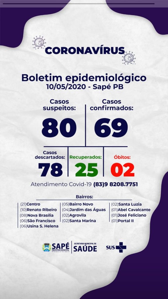 A Secretaria Municipal de Saúde de Sapé, Zona da Mata da Paraíba, divulgou um novo boletim epidemiológico na tarde deste domingo (10) com novos números de casos confirmados na cidade. Segundo o referido boletim, os casos passaram de 60 para 69 e foi confirmado mais um óbito pelo vírus no município. O primeiro óbito foi […]