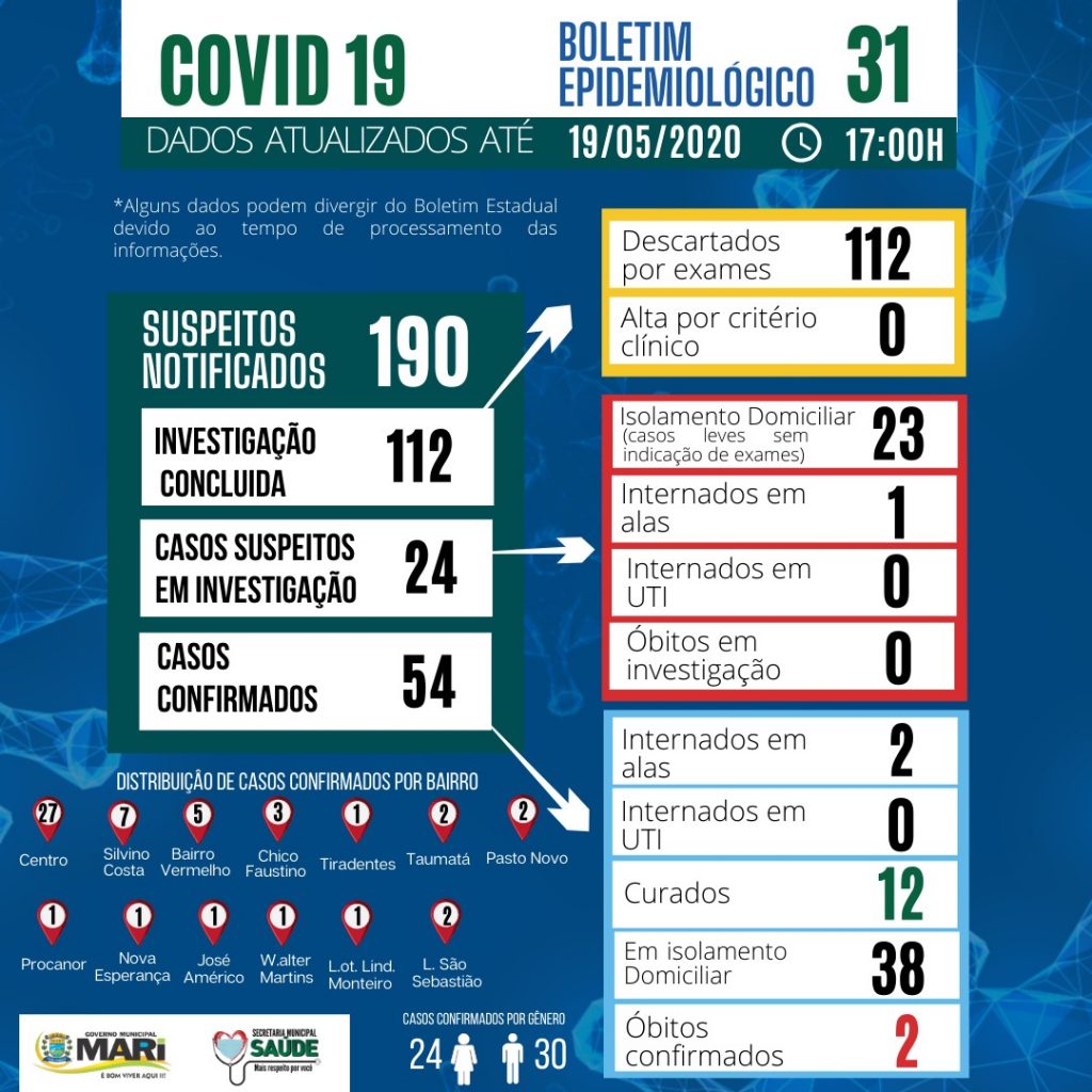 A Secretaria Municipal de Saúde de Mari-PB publica o Boletim Epidemiológico sobre o Coronavírus (COVID 19) , com dados atualizados até às 17:00 H desta terça-feira (19 de maio). O Boletim informa que o número de pacientes curados do COVID 19 aumentou para 12 o número de casos positivos da doença aumentou para 54. A […]