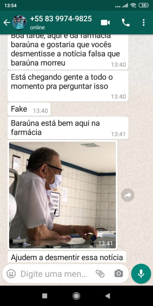 No início da tarde deste sábado (23) uma notícia falsa tomou conta dos grupos de whatsaap da cidade de Mari, dando conta de que o farmacêutico Baraúna, ex-vice-prefeito do município teria vindo a óbito na Policlínica Municipal. De imediato o boato se espalhou pela cidade e a família de seu Baraúna começou a receber pessoas […]