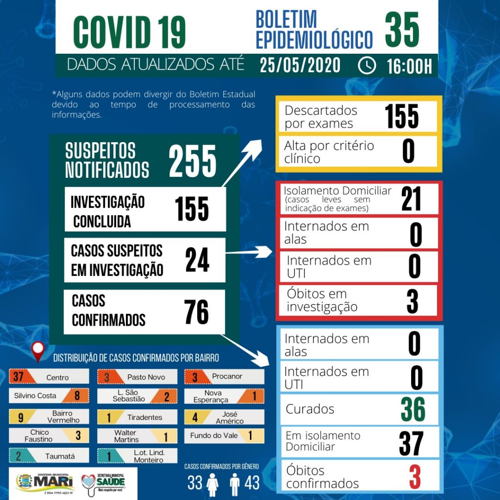 Em Mari, número de pacientes curados da Covid-19 sobe para 36 e casos confirmados chegam a 76