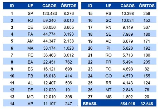 Veja abaixo a distribuição dos casos e mortes por estado: