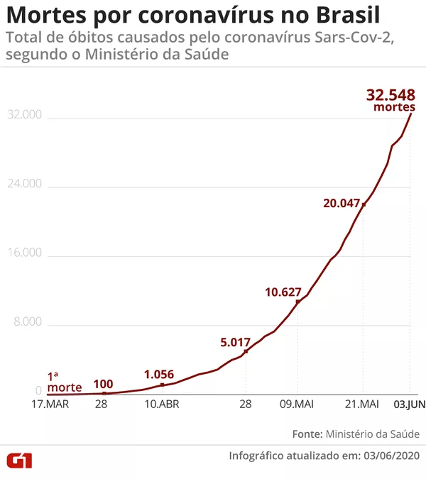 Brasil registra 1.349 mortes por coronavírus e bate novo recorde diário; total é de 32.548