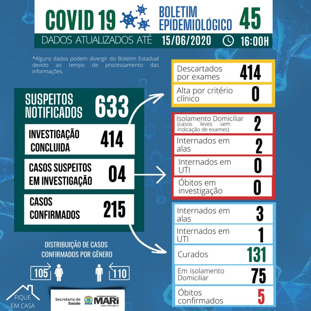 Em Mari, 12 novos casos da Covid-19 são confirmados; 4 pacientes estão internados e 1 em UTI