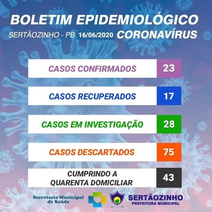 Sertãozinho tem 23 casos confirmados de Covid-19. O município tem 43 em isolamento domiciliar, 28 casos em investigação e 75 casos descartados. A boa notícia é que 17 pessoas infectadas pelo coronavírus já estão curadas.