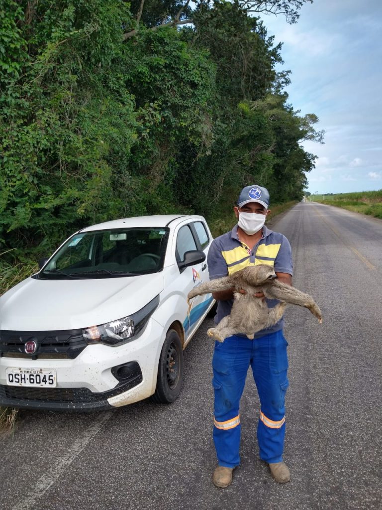 Bicho-preguiça recebe ajuda de servidor da Prefeitura de Curral de Cima para atravessar rodovia 071