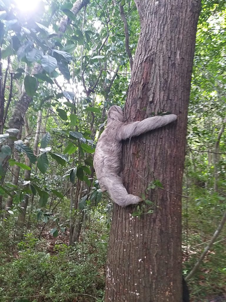 “É comum vermos animais assim nas rodovias. Ao ver a preguiça na rodovia, ela corria o risco de ser atropelada. Eu já tinha tido contato com animais silvestres antes. Então usei uma técnica de pegar nela, sem que ela encostasse em mim, por conta das garras afiadas que ela tem. Fiz a travessia dela, como ela queria”. Relatou Tandy.
