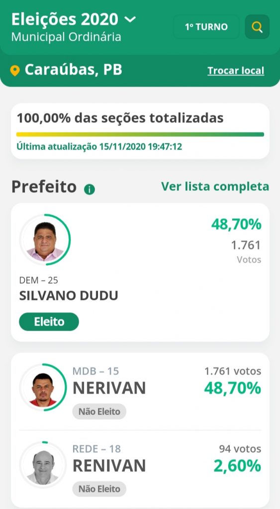 Foto/ Reprodução TSE O Município de Caraúbas, na Paraíba, terminou com a disputa para prefeito empatada. O atual prefeito Silvano Dudu (DEM) e Nerivan (MDB) tiveram exatamente 1.761 votos cada. No fim, contudo, Silvano foi reeleito por ser o mais velho dentre os dois. Confira os números da apuração em Caraúbas Silvano Dudu nasceu em […]