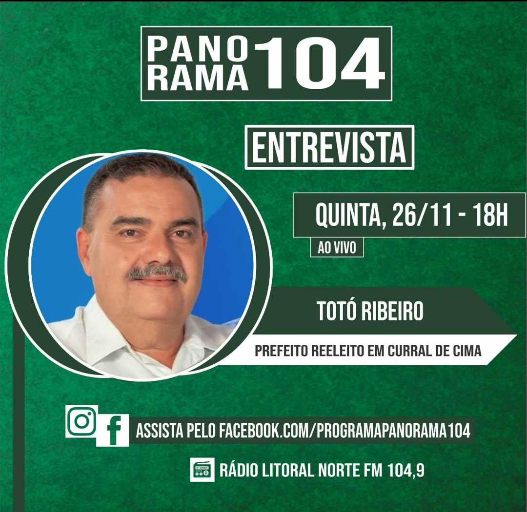 O Prefeito reeleito de Curral de Cima, Totó Ribeiro (PP), estará nesta Quinta-feira (26) nos estúdios da Rádio Litoral Norte FM, a partir dás 18h00 no Programa Panorama 104, o gestor vai fazer uma avaliação do resultado das eleições e também projetar os trabalhos para o próximo mandato. Ele foi reeleito junto ao seu vice, Aécio Flávio, com 2.379 votos, o que representa 50,78% do total.