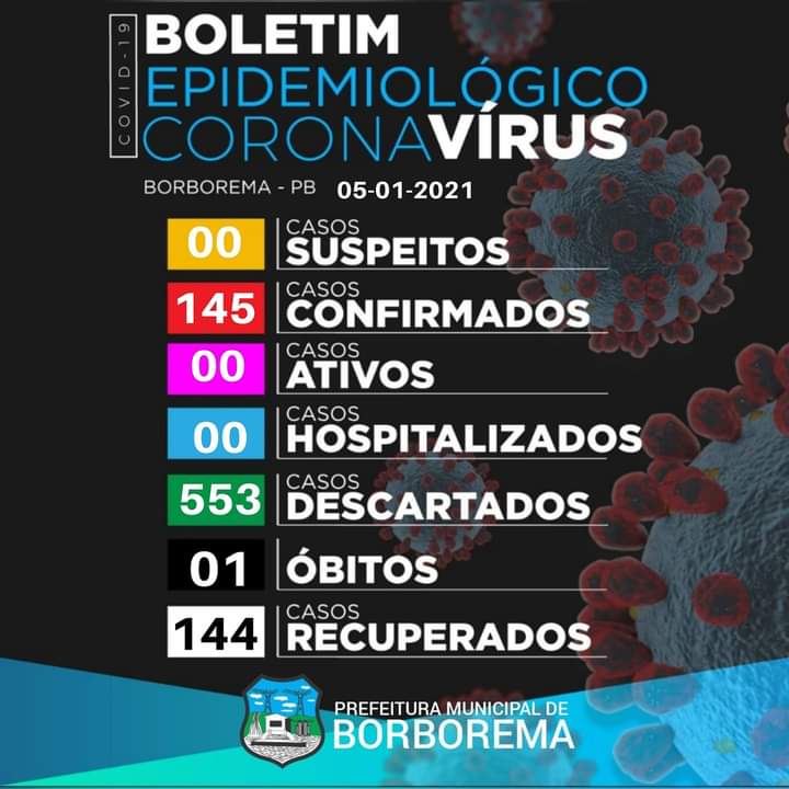 Informações e atualizações oficiais da Covid-19 no município podem ser consultadas nos Boletins Epidemiológicos, emitidos todos os dias ao final da tarde e publicados na página oficial do Facebook da Prefeitura – facebook.com/prefeitura.borborema
