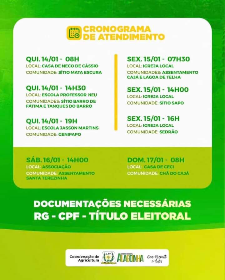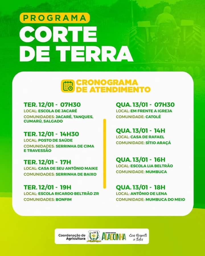 A Prefeitura Municipal de Alagoinha por meio da Secretaria de Agricultura, dará inicio nesta semana ao recadastramento dos produtores no programa cortes de terra, ação que visa melhorar as condições dos produtores rurais. O programa é realizado, de forma gratuita pelo quinto ano consecutivo, através da gestão municipal.
