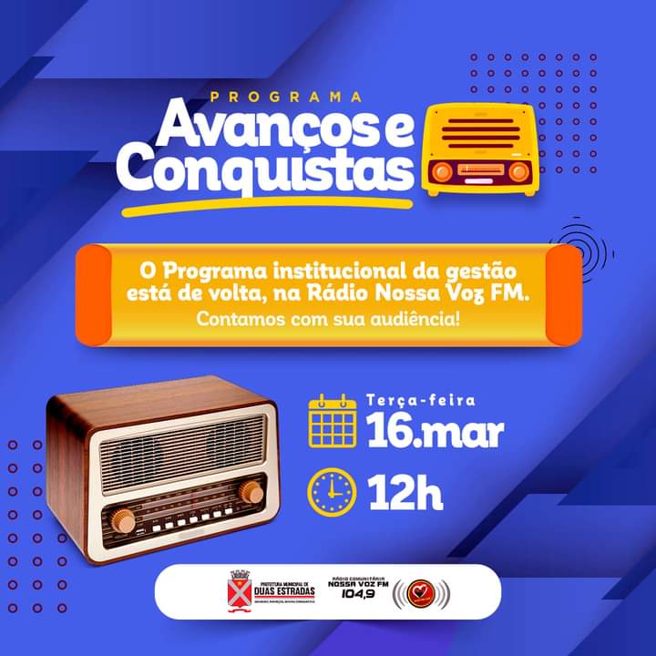 Retornando nesta terça-feira 16/03 o programa de rádio institucional da administração municipal de Duas Estradas. O programa irá ao ar pela Rádio Nossa Voz FM através da 104,9 (ZYX 734) todas as terças-feiras no horário de 12h00min às 13h00min. Com novo nome, o Programa Avanços e Conquistas também terá um novo apresentador, Josinaldo Costa. O […]