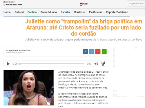 A Agência de Notícias ODIA1 publicou reportagem sobre o caso dos vereadores de Araruna que reprovou o título de Cidadã Ararunense a ganhadora do BBB21 da Rede Globo, a paraibana Juliette e criticou a postura dos parlamentares. Na visão da agência, a sister vem sendo usada como trampolim político na disputa de poder entre os […]