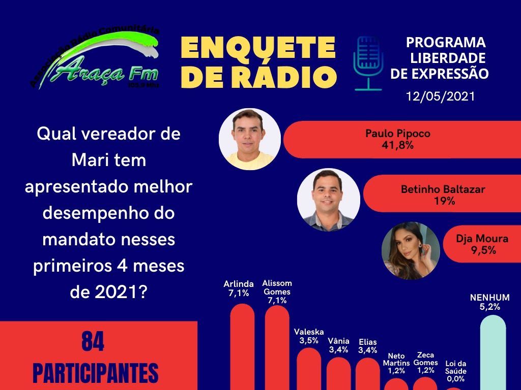 Com o objetivo de saber qual a avaliação da opinião pública quanto a atuação dos 11 vereadores da Câmara Municipal de Mari, o Programa Liberdade de Expressão da Rádio Araçá FM realizou nesta quarta-feira (12) uma sondagem com seus ouvintes. O resultado apontou os vereadores Paulo Pipoco (PL), Betinho Baltazar (PL) e Djá Moura (PTB) […]
