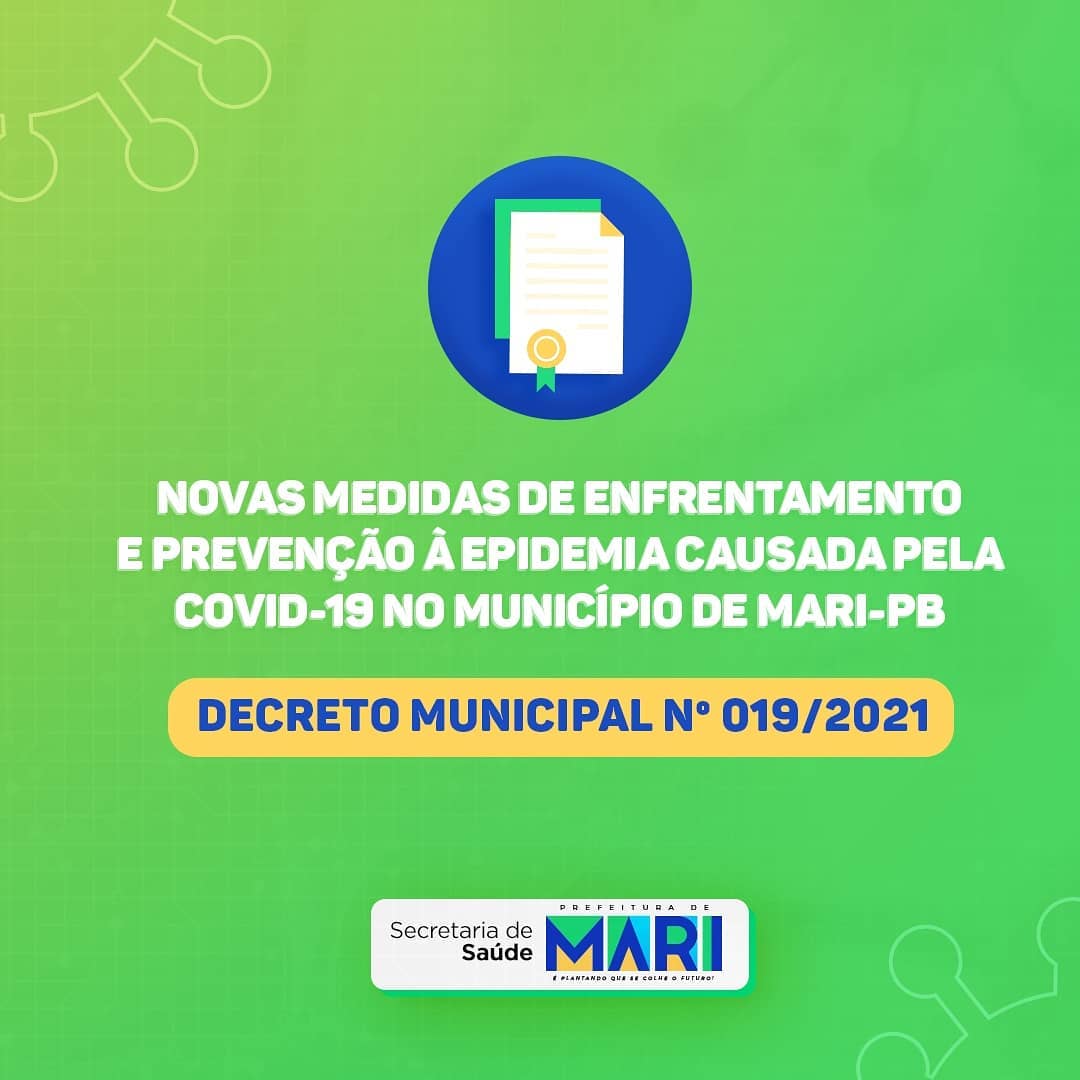 Devido ao aumento de casos positivos de Covid-19 no município de Mari, a administração municipal emitiu um novo decreto, 019/2021. As novas medidas temporárias e emergenciais visam à prevenção de contágio pelo Novo Coronavírus (COVID-19, e a manutenção dos atendimentos estáveis nos setores de saúde