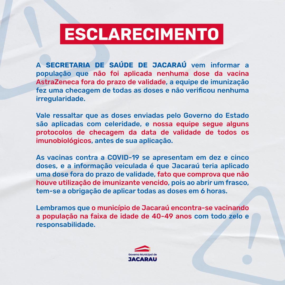 A Prefeitura de Jacaraú publicou uma nota, por meio da Secretaria de Saúde, afirmando que desde o início do processo de vacinação, até o presente momento, não há registro na cidade de recebimento de doses de vacina contra o coronavírus que estejam fora do prazo de validade.