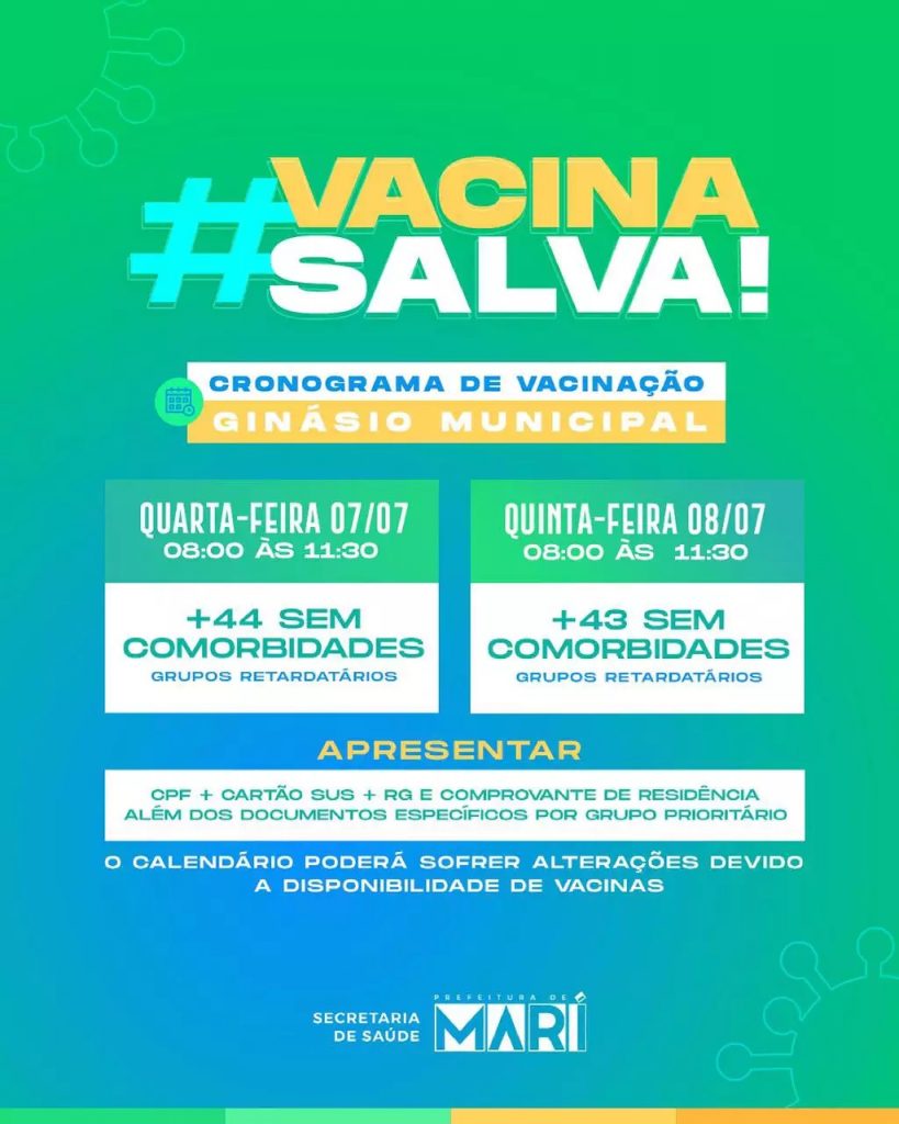 COVID-19: Com um terço da população vacinada com a 1ª dose, Mari avança e vacina nesta quarta (7) pessoas com 44 anos e na quinta (8) 43 anos