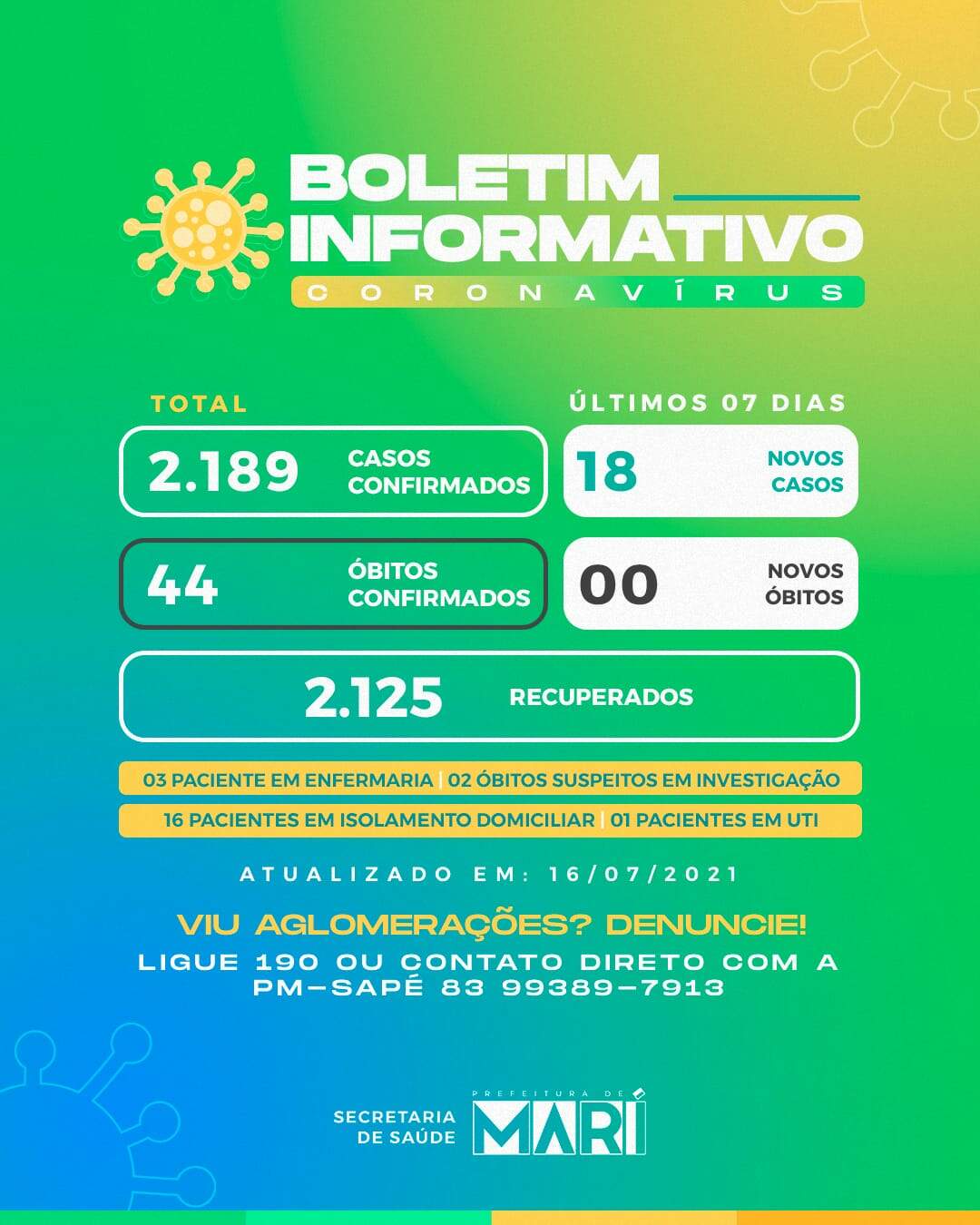 Com muito otimismo a secretária Emanuelle Chaves destacou “ Agradeço o empenho dos servidores da saúde que a mais de 18 meses trabalham com responsabilidade e comprometimento no combate à pandemia do novo coronavírus. A campanha “Mari Nossa Bandeira é Verde” fortaleceu a união da administração municipal, vereadores e segmentos da sociedade, e tornou possível a diminuição de casos positivos, óbitos e internações provocadas pelo contágio do Covid-19. Com o avanço na vacinação a tendência é de maior diminuição de casos e estamos otimistas de na próxima avaliação estadual ver o município de Mari na bandeira verde que vai permitir a volta gradativa ao novo normal”