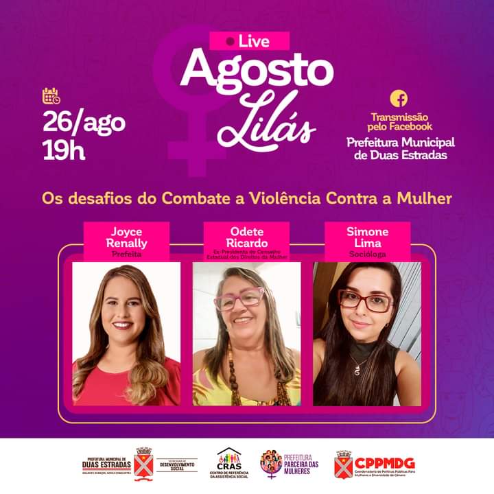 Prefeitura de Duas Estradas realiza live ‘Agosto Lilás’ sobre os desafios do combate à violência contra a mulher nesta sexta-feira (27)