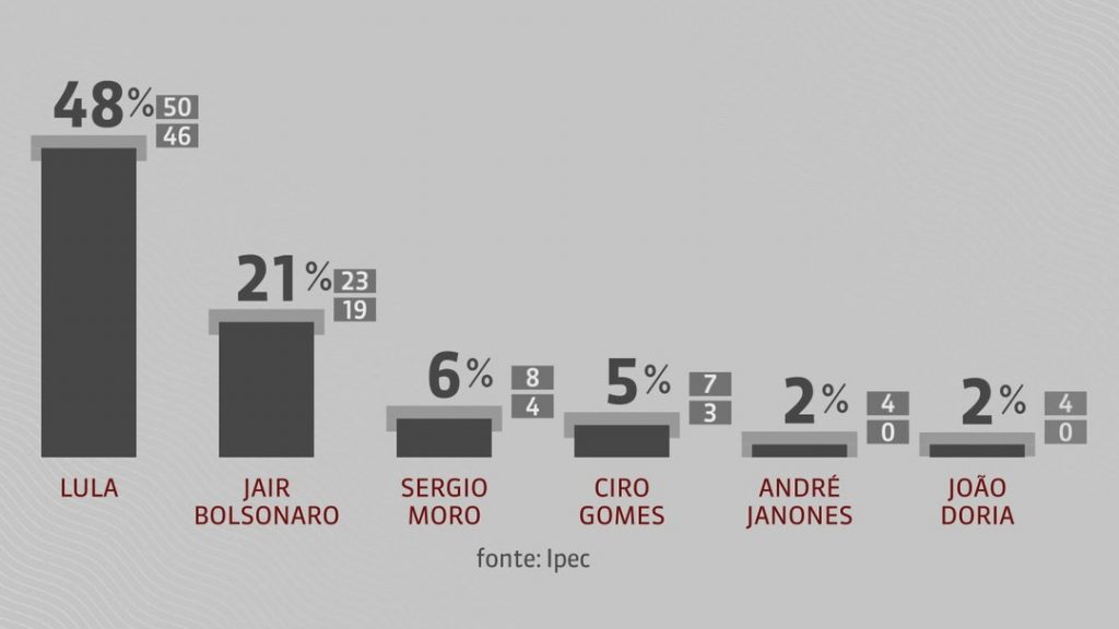 Segundo o Ipec, as intenções de voto em Lula são maiores quanto menor a renda familiar mensal e a escolaridade dos entrevistados. O ex-presidente tem 32% entre quem tem renda familiar mensal acima de 5 salários mínimos e atinge 57% entre quem tem renda familiar até 1 salário mínimo. Atinge 40% entre os com nível superior e chega a 55% entre quem tem o ensino fundamental.