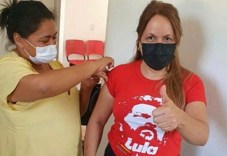 Doutora Tekinha como é carinhosamente chamada pelos curralenses, estava com uma camisa vermelha com a foto do pré-candidato a presidente da República nas eleições 2022, Luiz Inácio Lula da Silva (PT).