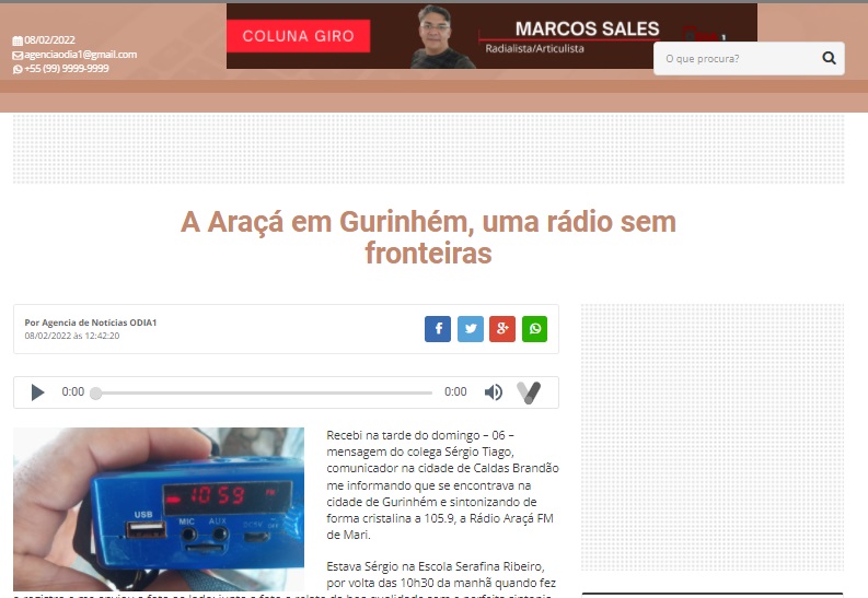 Em artigo publicado na Coluna Giro, no site da agência ODIA1, o radialista Marcos Sales comemorou o fato da Rádio Araçá FM de Mari, onde o mesmo apresenta um jornalístico diário, está presente em pelo menos seis cidades da região, a exemplo de Caldas Brandão, Sapé, Cajá e Gurinhém.