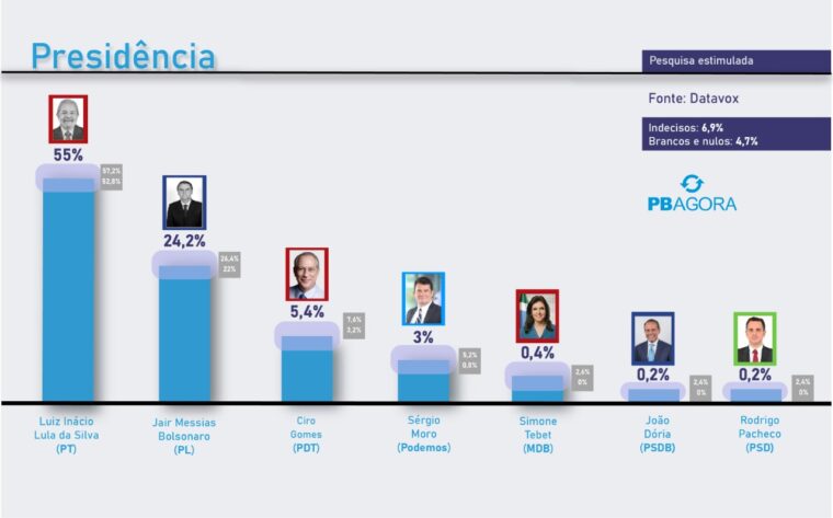 Contratada pelo PB Agora e realizada pelo Instituto Datavox, a 1ª pesquisa para presidente da República de 2022 põe o ex-presidente Lula (PT) como o preferido dos paraibanos no pleito deste ano com 55% das intenções de votos. Em segundo lugar, quem surge é o presidente Jair Bolsonaro (PL) com 24,2%, seguido por Ciro Gomes […]